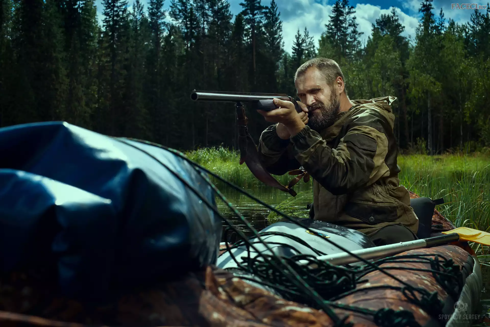 Szuwary, Polowanie, Myśliwy, Woda, Las, Strzelba, Ponton - faceci.biz
